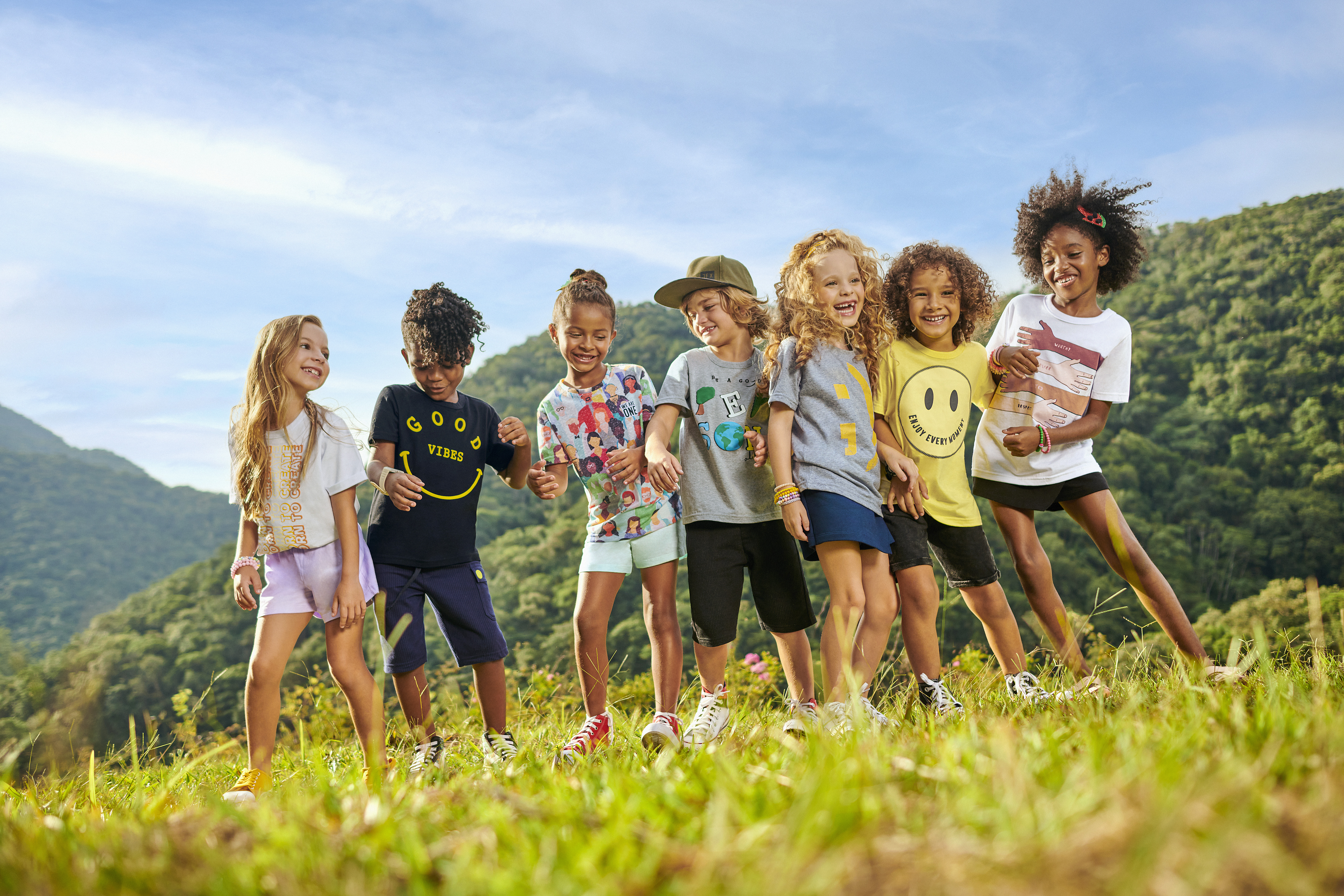 Positive Vibes: composta por peças produzidas com malha reviva (feita de fio reciclado de garrafa PET) que falam do empoderamento, do cuidado e do amplo respeito a todos com mensagens positivas. As camisetas são para meninos e para meninas, com estampas superdivertidas e inclusivas.