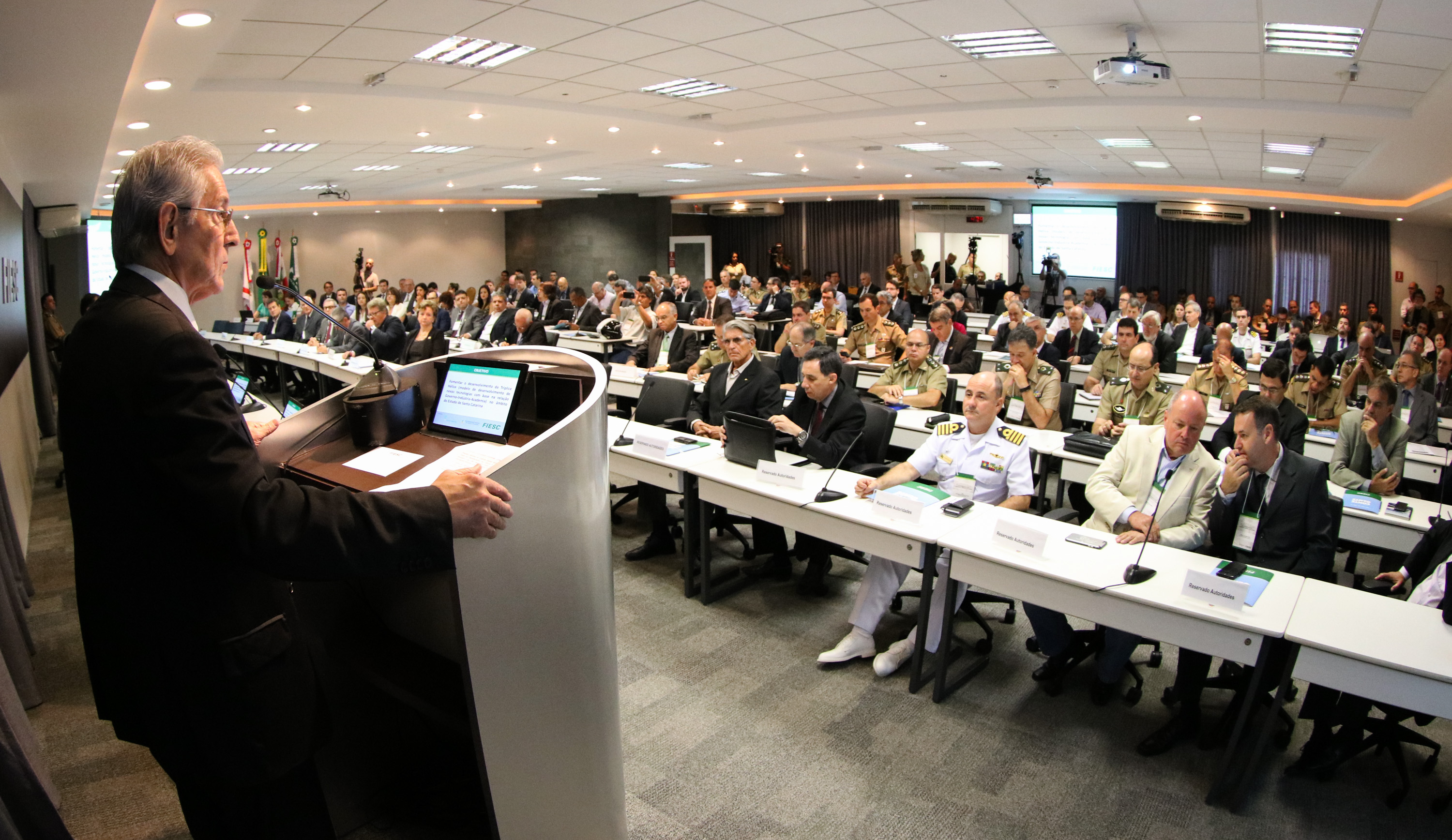 Em seu pronunciamento, o presidente da FIESC, Glauco José Côrte, disse que boa parte do que o setor de defesa demanda é importado e Santa Catarina fabrica praticamente todos os produtos que os militares consomem. “As Forças Armadas, sobretudo o Exército, são grandes demandantes de produtos que fabricamos em Santa Catarina, mas que hoje temos uma participação muito baixa no suprimento das necessidades deles. Portanto, estamos fazendo um grande esforço no sentido da aproximação da indústria com as Forças Armadas e, por outro lado, temos buscado uma grande aliança em torno de inovação, ciência e tecnologia que também é tradição do Exército”, afirmou.