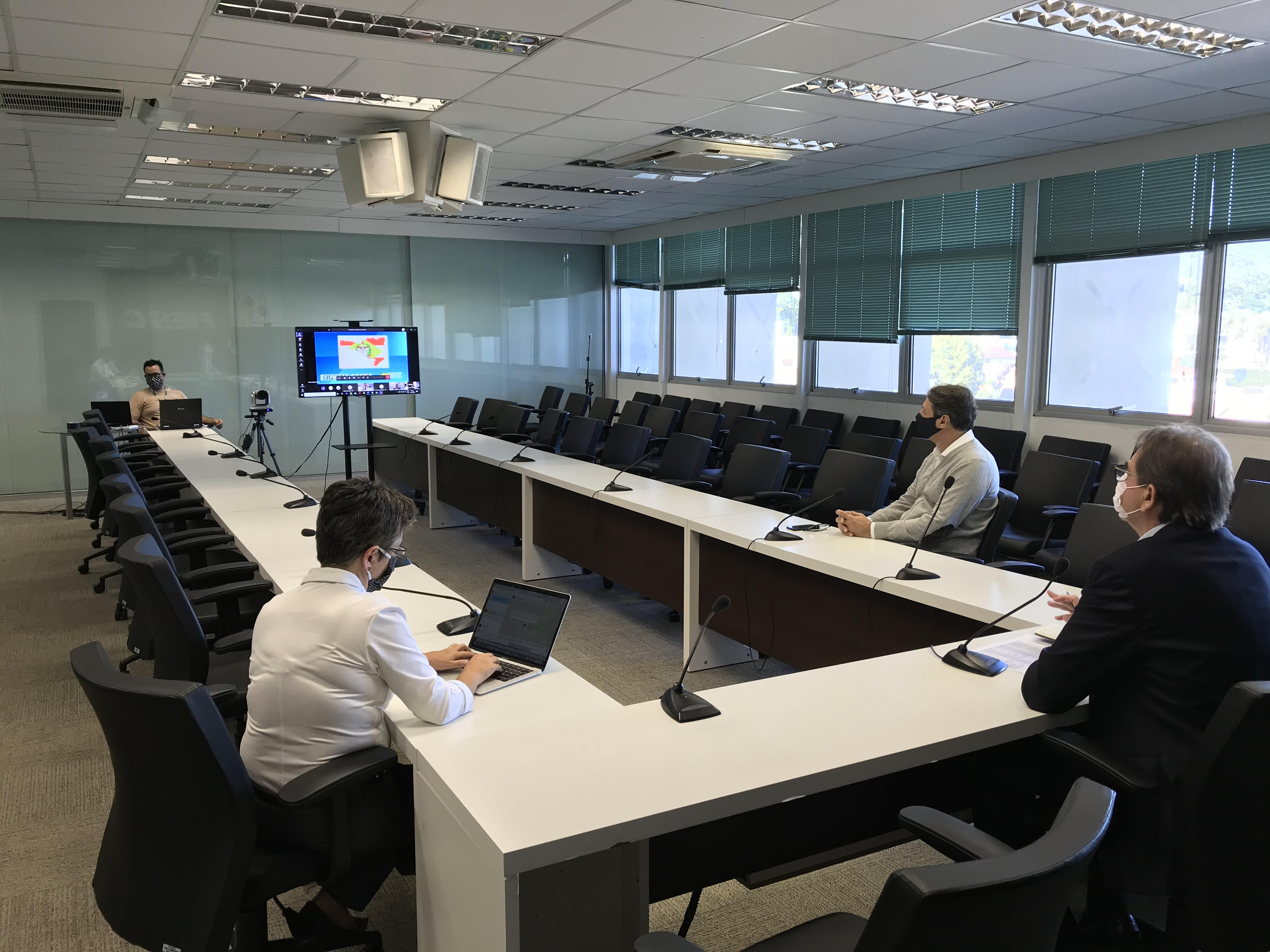 Florianópolis, 15.4.2020 – O superintendente de rede da Caixa Econômica em Santa Catarina, Adriano Borges Resende, e executivos do banco de todas as regiões catarinenses, participaram na manhã desta quarta-feira (15) de videoconferência com o presidente da Federação das Indústrias de Santa Catarina (FIESC), Mario Cezar de Aguiar, e os 16 vice-presidentes regionais da entidade. O objetivo do encontro foi apresentar as linhas de financiamento disponíveis aos industriais catarinenses para fazer frente ao momento de pandemia, que afeta fortemente o capital de giro das empresas.