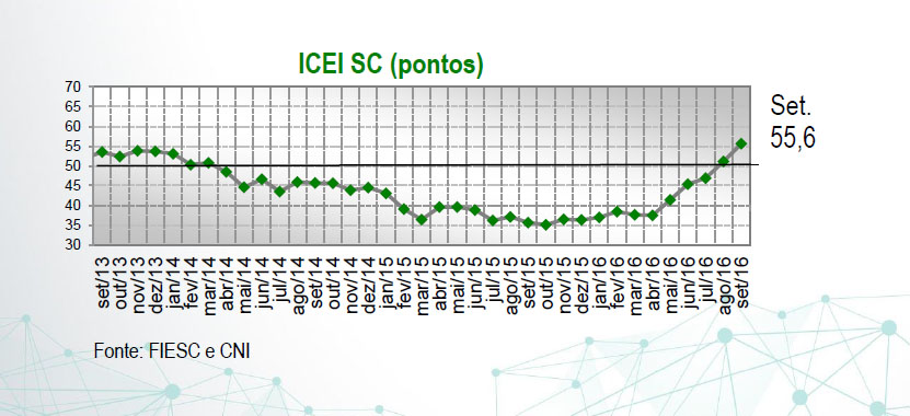 Florianópolis, 20.9.2016 – A confiança do industrial catarinense registrou novo aumento em setembro. O índice atingiu 55,6 pontos e cresceu 4,5 pontos em relação ao mês anterior. Este é o melhor resultado desde março de 2013. O indicador de setembro também é superior à média histórica, iniciada em julho de 1999 (53,3 pontos). A pesquisa Índice de Confiança do Empresário Industrial (ICEI) foi realizada pela Federação das Indústrias de Santa Catarina (FIESC) em conjunto com a Confederação Nacional da Indústria (CNI), com 199 indústrias. Clique aqui e veja a pesquisa completa.