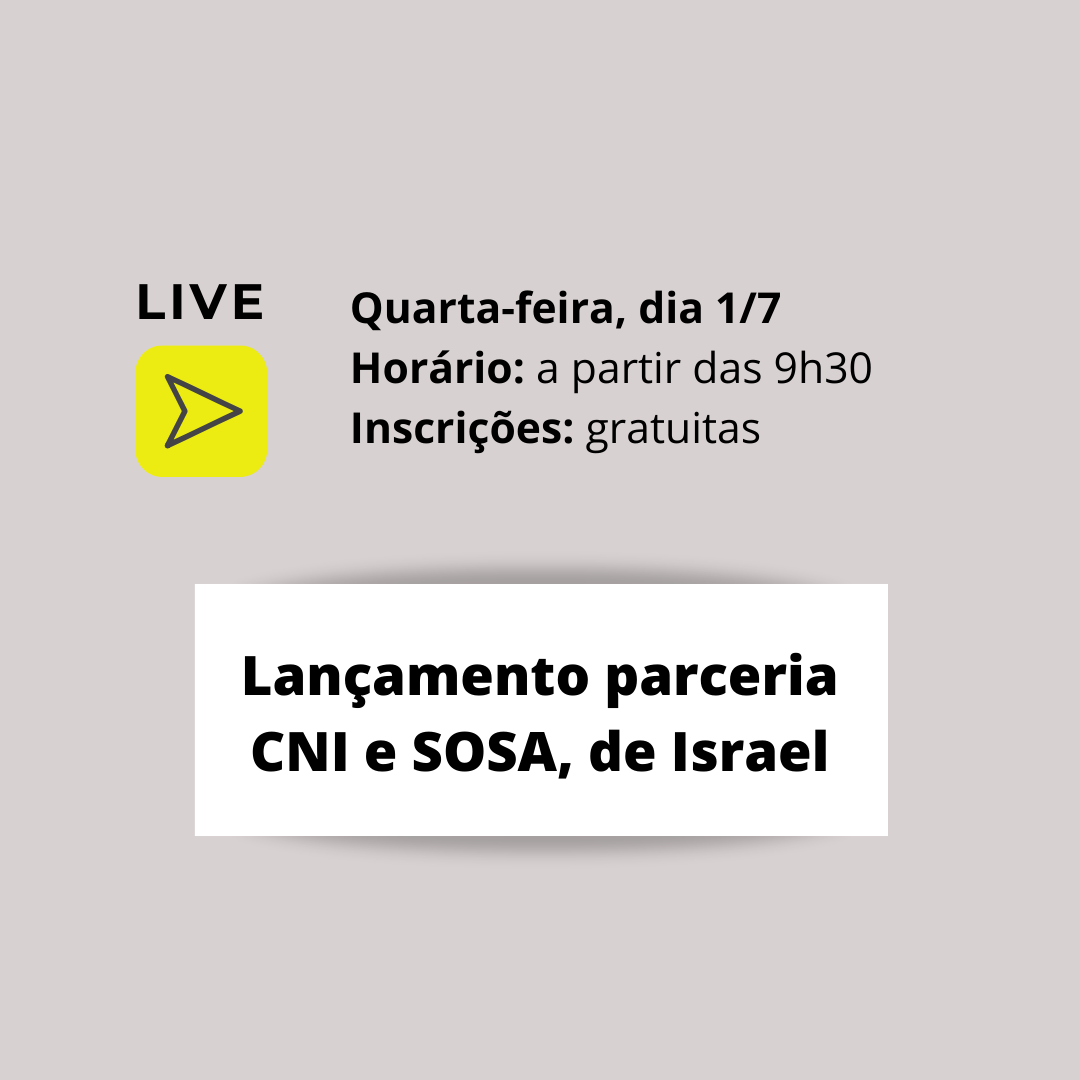 Florianópolis, 26.6.2020 – Na próxima quarta-feira, dia 1 de julho, a partir das 9h30, será realizada live para lançar uma parceria entre a Confederação Nacional da Indústria (CNI) e SOSA, empresa mundial de inovação aberta, com escritórios em Tel Aviv e Nova York. Clique aqui para fazer sua inscrição gratuita. O link da transmissão será enviado por e-mail.