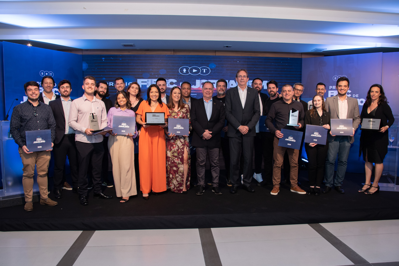 Florianópolis, 20.10.2022 - A Federação das Indústrias (FIESC) entregou na noite desta quinta-feira, dia 20, o Prêmio FIESC de Jornalismo 2022. Foram reconhecidos nove trabalhos – sendo três em cada categoria (Áudio, Texto e Vídeo) – e a premiação em dinheiro totaliza R$ 102 mil. A solenidade foi realizada na sede da FIESC, em Florianópolis, e contou com a presença de profissionais de imprensa e de lideranças industriais. Confira abaixo a lista dos vencedores.