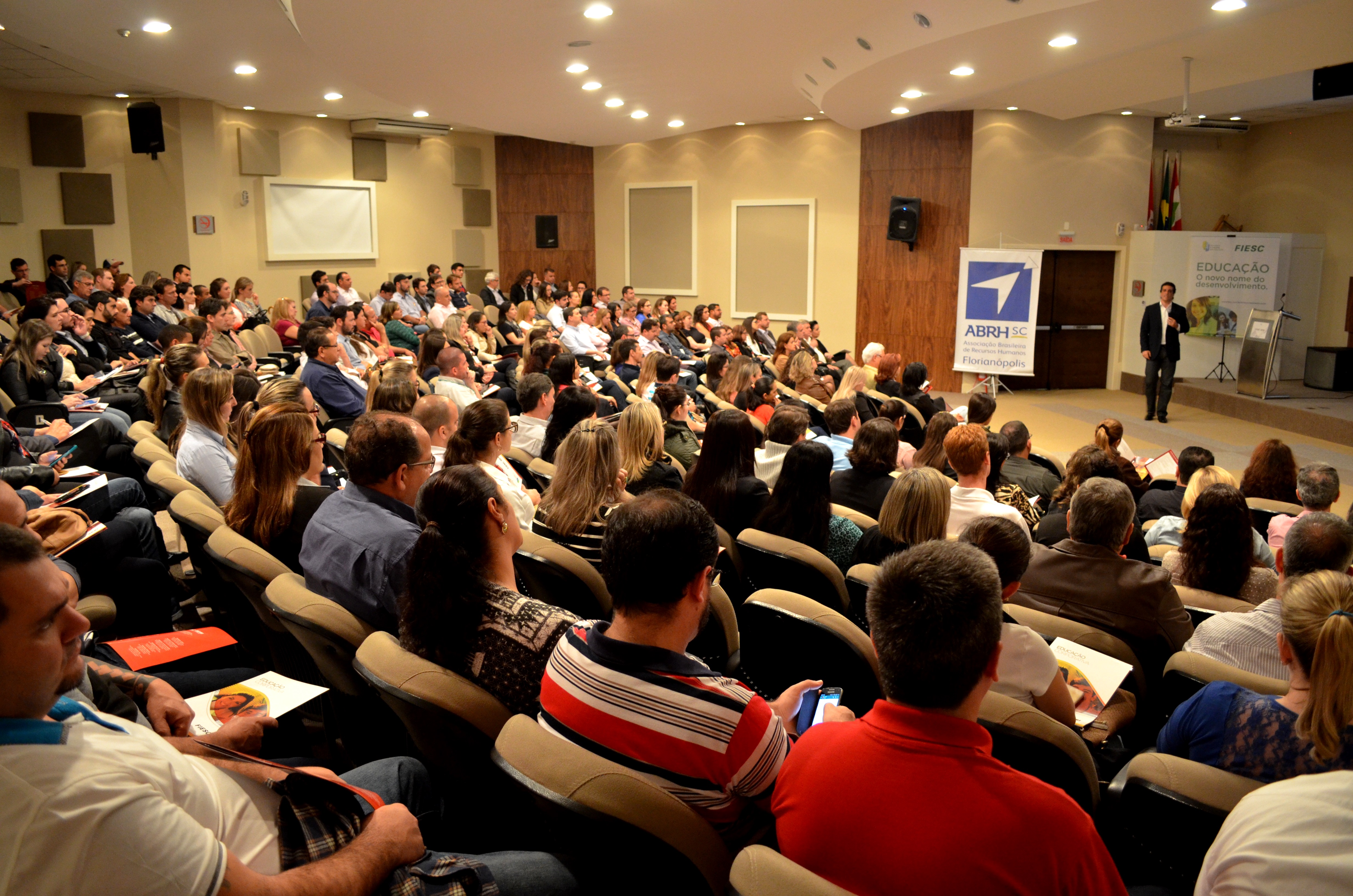 Florianópolis, 29.10.2015 – Cerca de 220 empresários, estudantes e gestores de RH, representantes de 110 indústrias da Região da Grande Florianópolis, participaram nesta terça-feira (27) de um workshop sobre engajamento de líderes, empreendedorismo e gestão. O evento, promovido pela SESI/SC, entidade da FIESC, contou com palestra do especialista Rogério Chér.