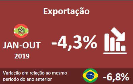Florianópolis, 5.11.2019 – As exportações catarinenses de janeiro a outubro somaram US$ 7,33 bilhões. O valor é 4,3% menor que o registrado no mesmo período do ano passado, mostram dados do Ministério da Economia, divulgados pelo Observatório FIESC. Os principais produtos embarcados no período foram: carnes de aves, que representa 22,2% da pauta exportadora e cresceu 9,9% em relação ao mesmo período de 2018, carne suína, com participação de 8,6% e crescimento de 29,6%, e soja, com participação de 7,4% e retração de -33,7%. Os demais itens com maior participação na pauta são partes de motor (4,9%) e motores elétricos (4,4%), que registraram variação de 0,6% e 1,09%, respectivamente. Veja aqui os dados completos