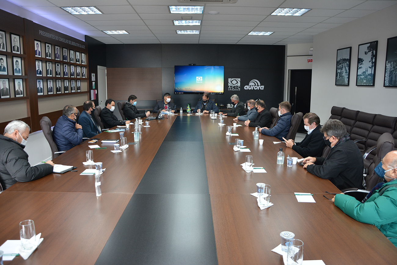 Florianópolis, 30.6.2021 - Melhorias na infraestrutura, incluindo investimentos em rodovias e ferrovias, na energia elétrica e no abastecimento de água no oeste. Esses foram os principais temas discutidos por dirigentes da Federação das Indústrias do Estado de Santa Catarina (FIESC) e da Associação Comercial e Industrial de Chapecó (ACIC), em reunião nesta quarta-feira (30), em Chapecó. Também foi reforçada a parceria entre as entidades para atuar na busca de soluções para os gargalos existentes na região.