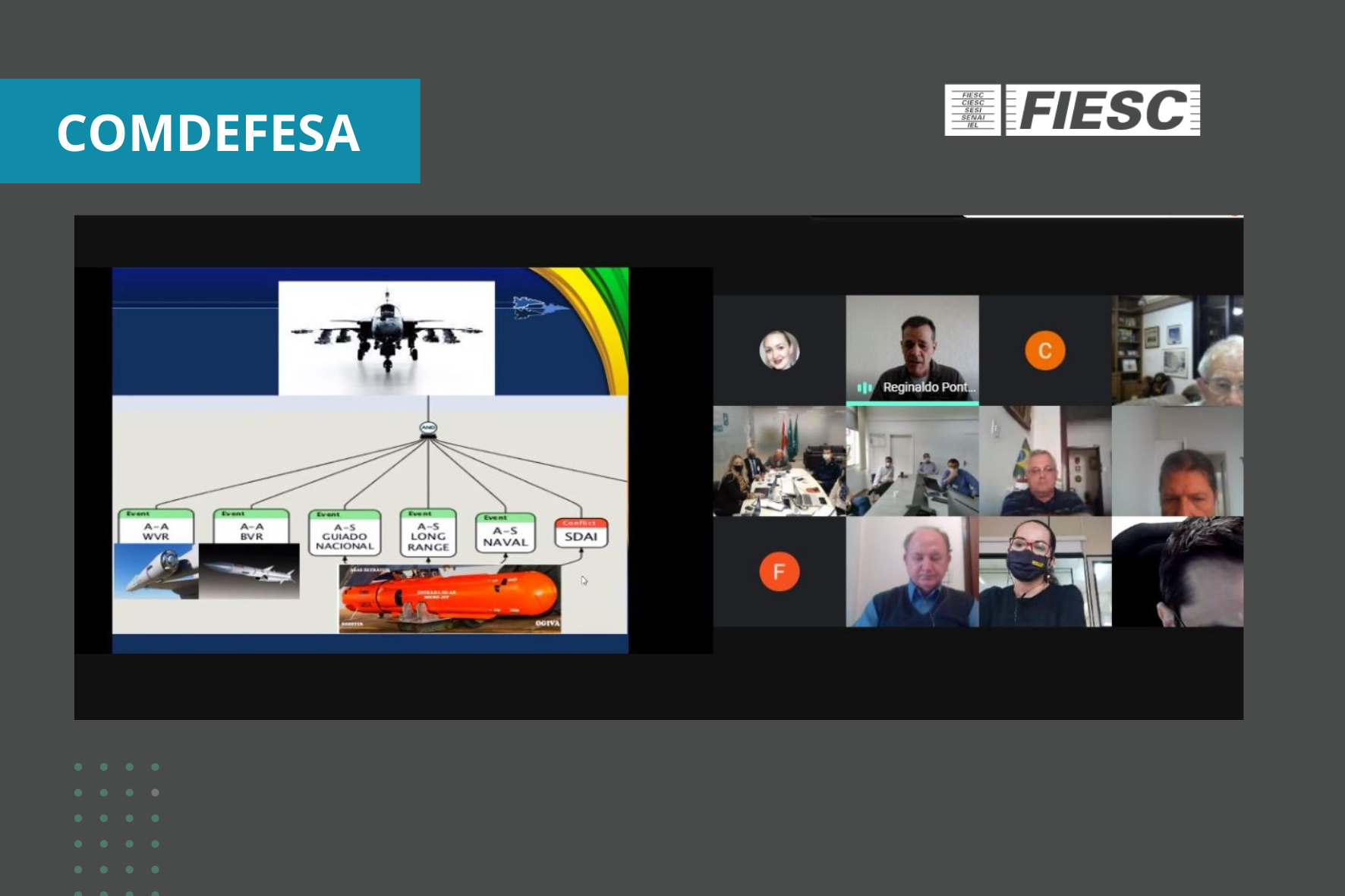 Florianópolis, 9.9.2020 – Em reunião do Comitê da Indústria de Defesa da FIESC (Comdefesa), o brigadeiro do ar, Paulo Ricardo Laux, chefe da 7ª subchefia do Estado-Maior da Aeronáutica, apresentou a indústrias catarinenses projetos estratégicos da instituição que demandam pesquisa, tecnologia e inovação e que podem ser atendidas por empresas e instituições catarinenses. A reunião virtual foi realizada nesta quarta-feira, dia 9.