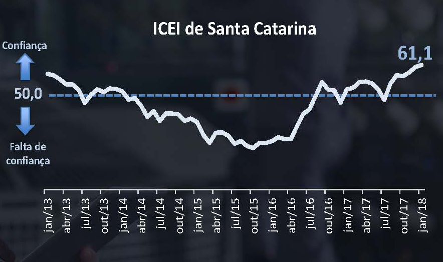 A percepção das condições atuais e as expectativas para os próximos seis meses explicam o crescimento. A confiança do empresário na indústria de transformação foi de 62 pontos em janeiro, puxada principalmente pelo indicador de expectativas e este, por sua vez, pela perspectiva dos empresários quanto ao desempenho futuro da economia brasileira e catarinense.