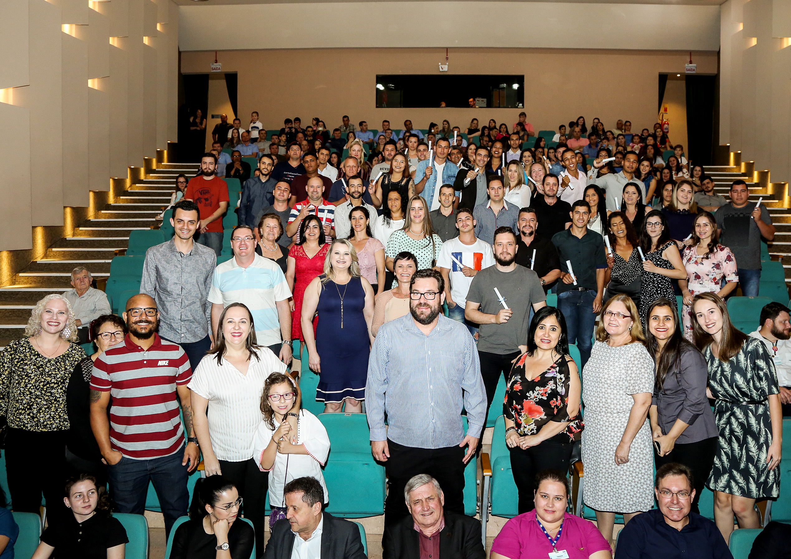 Florianópolis, 26.9.2018 – A FIESC, por meio do SESI, realizou nesta terça-feira (25), no Centro Cultural da SCAR – Sociedade Cultura Artística, em Jaraguá do Sul, solenidade de formatura de mais uma turma de educação de jovens e adultos. Receberam certificados de conclusão do ensino fundamental e do ensino médio profissionalizante 160 alunos, dos quais 17 na modalidade in company, com aulas realizadas na empresa Nanete Têxtil. Em dezembro, mais 200 alunos devem ser certificados.
