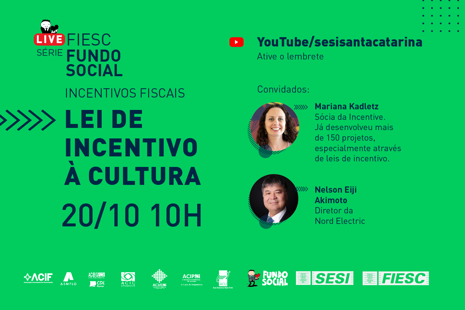Florianópolis, 16.10.2020 – A segunda live da série Fundo Social: Incentivos Fiscais, que a Federação das Indústrias (FIESC) promove até novembro, esclarece dúvidas sobre a lei federal de Incentivo à Cultura. Participam do encontro o empresário Nelson Eiji Akimoto, da Nord Electric, indústria de Chapecó que já destina parte do imposto devido à projetos culturais, e Mariana Kadletz, advogada e sócia da Incentive, empresa especializada no desenvolvimento e gestão de projetos vinculados a mecanismos de incentivos fiscais. A live será na terça-feira (20), às 10 horas, com transmissão pelo canal do SESI no YouTube.