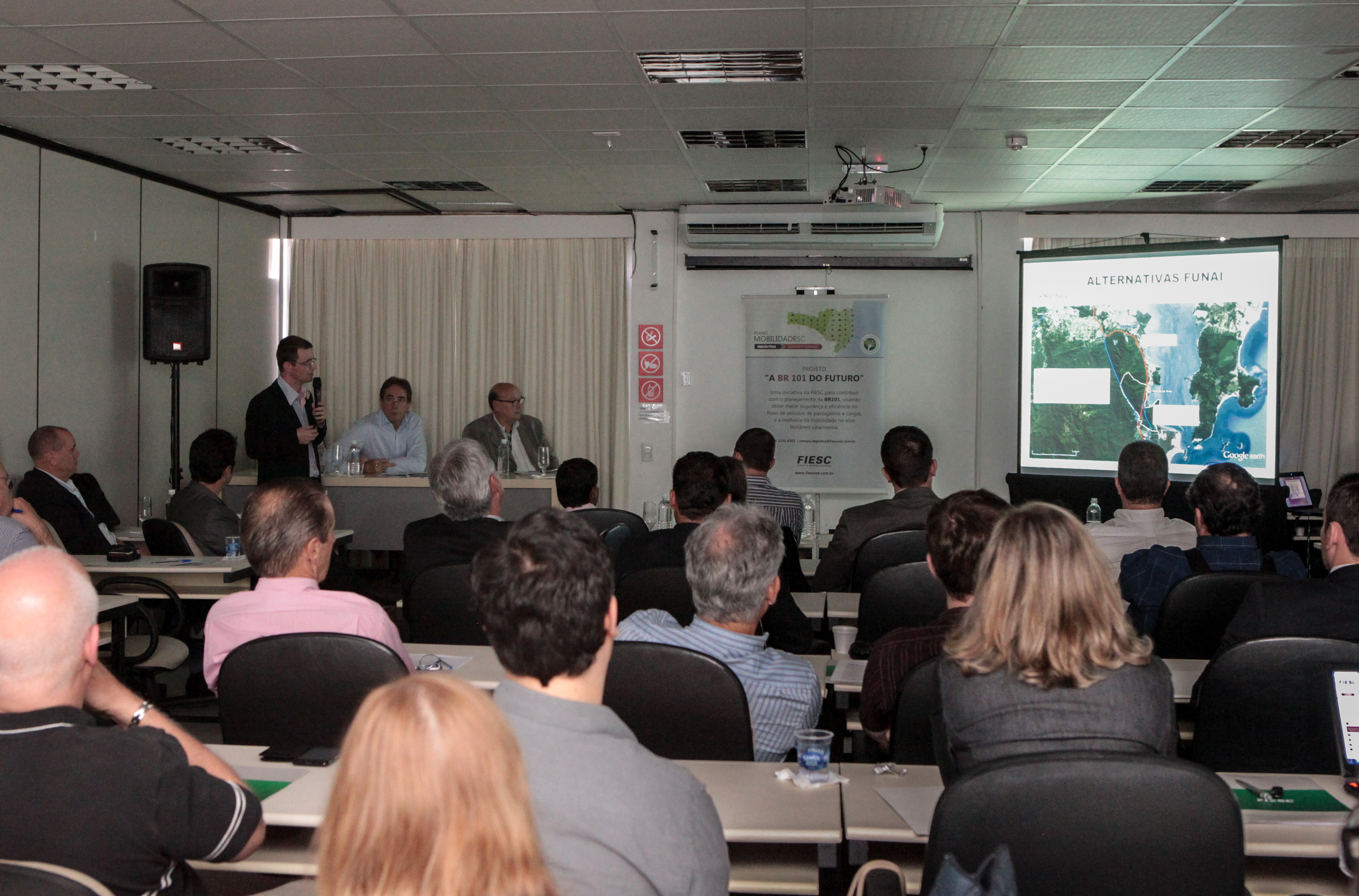 Florianópolis, 23.10.2014 - Assim como a duplicação do trecho Sul da BR-101, a construção da ferrovia Litorânea sofre atraso com a indefinição sobre a transposição da área indígena do Morro dos Cavalos, em Palhoça. O impasse sobre a definição do trajeto da ferrovia foi explicado pelo engenheiro Robson Sebastiany, engenheiro da Prosul, em reunião da Câmara de Assuntos de Transporte e Logística da Federação das Indústrias de Santa Catarina (FIESC) nesta quinta-feira (23).