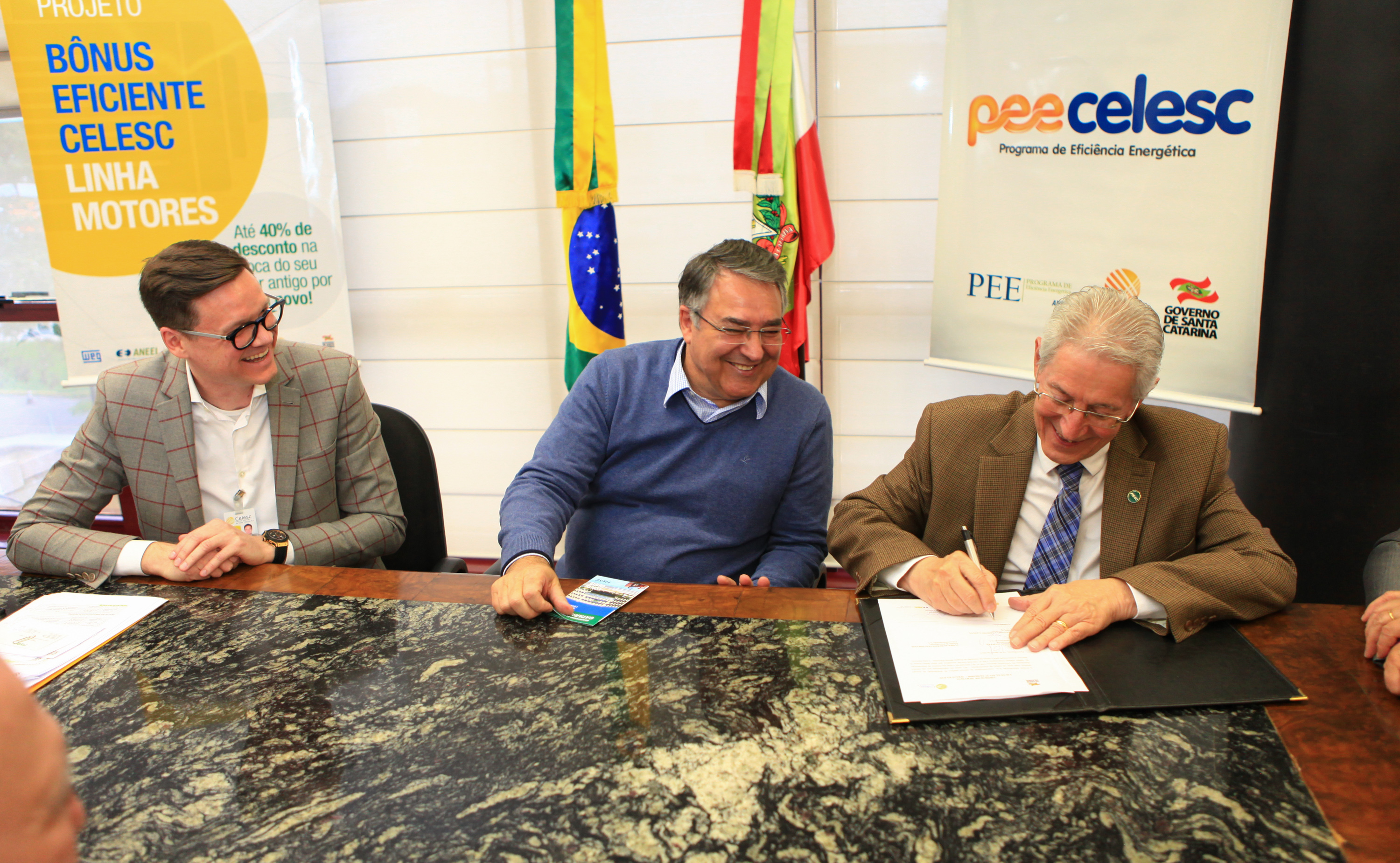 Florianópolis, 22.8.2017 – Para melhorar a eficiência energética de indústrias e do comércio em Santa Catarina, foi formalizado pelo governador Raimundo Colombo, pelo presidente Celesc, Cleverson Siewert, e pela Weg, o projeto Bônus Eficiente Linha Motores. O presidente da Federação das Indústrias de Santa Catarina (FIESC), Glauco José Côrte, participou do ato, nesta terça-feira (22), no gabinete do governador, em Florianópolis. O Bônus Eficiente integra o Programa Eficiência Energética da Celesc e visa combater o desperdício de energia elétrica nas indústrias, nos órgãos públicos e no meio rural, com a substituição de motores antigos e menos eficientes.