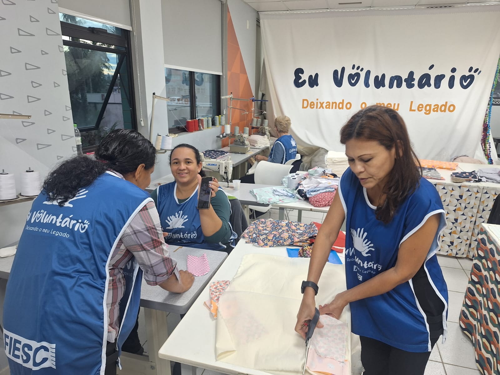 Em Joinville, há um espaço onde os voluntários se reúnem regularmente para produzir peças têxteis, como mantas, travesseiros e cachecóis, que são doados a pessoas em vulnerabilidade social e a pacientes de hospitais.