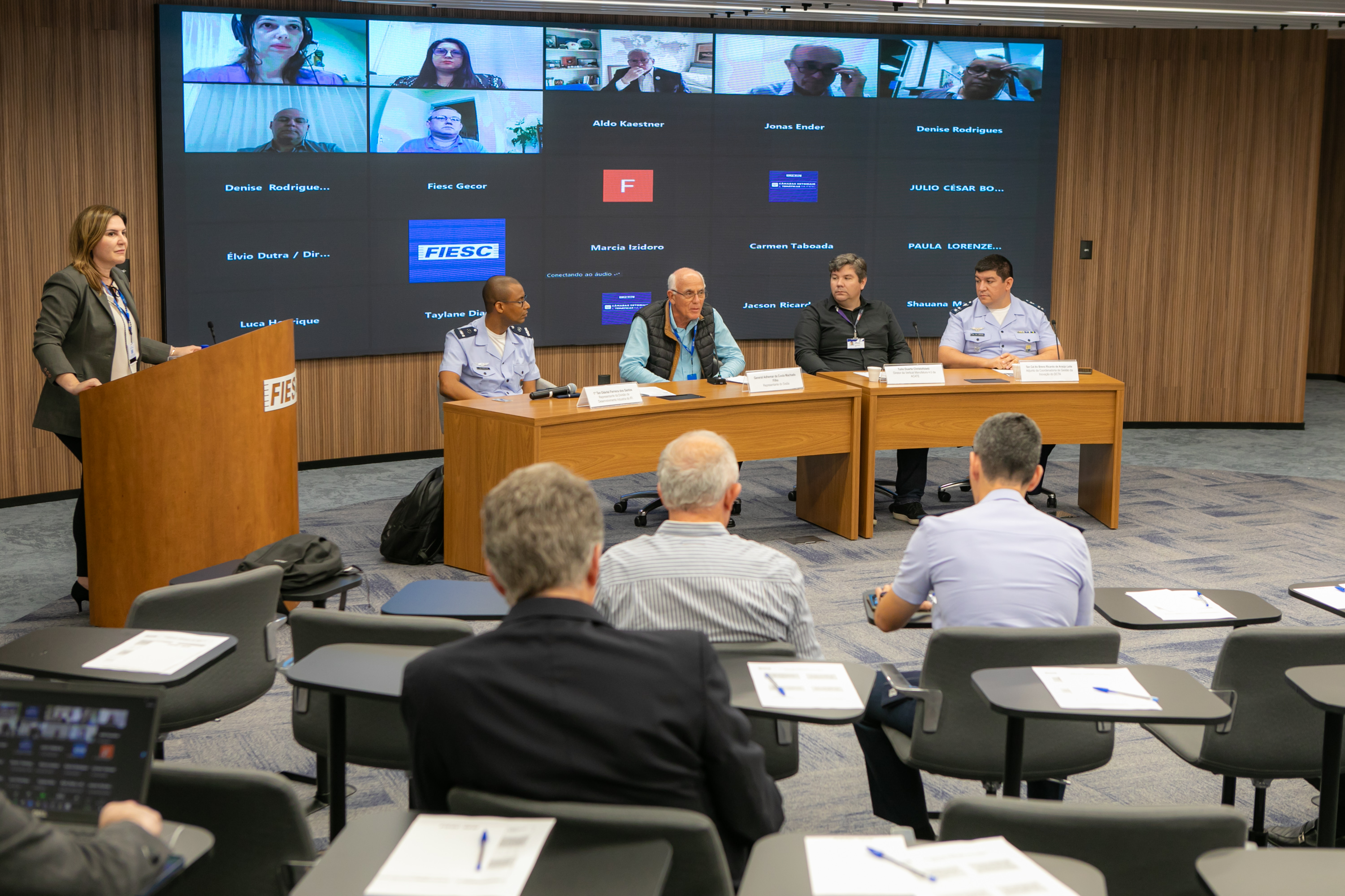 Florianópolis, 10.10.2023 - Indústrias catarinenses conheceram oportunidades de relacionamento e fomento da indústria aeroespacial brasileira em reunião do Comitê da Indústria de Defesa da FIESC (Comdefesa) e da Acate, realizada nesta terça-feira, dia 10. O tema foi abordado por representantes do Instituto de Fomento e Coordenação Industrial (IFI) e do Departamento de Ciência e Tecnologia Aeroespacial (DCTA), órgãos ligados ao Comando da Aeronáutica.