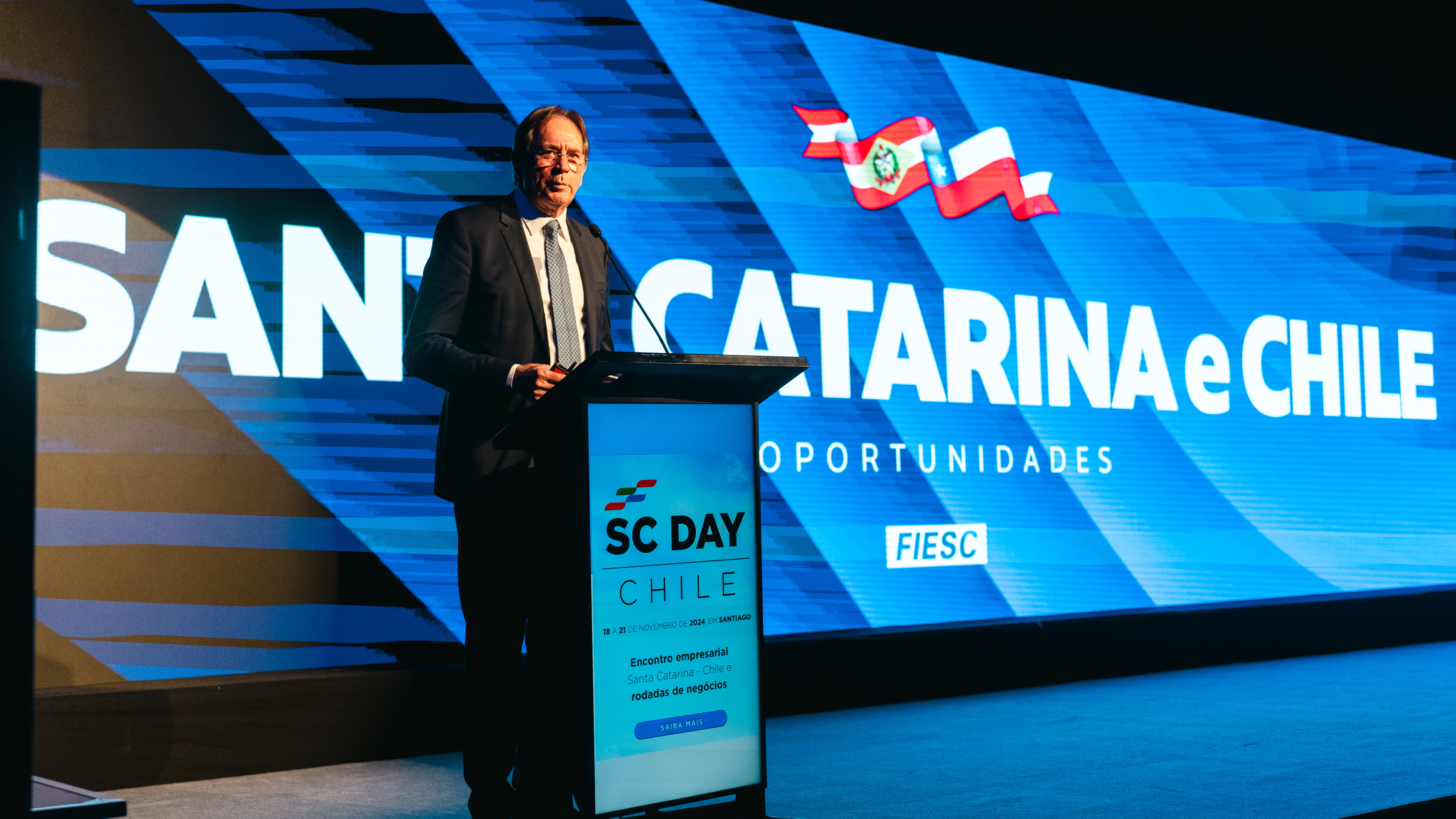 Florianópolis, 19.11.2024 - O SC Day Chile marca uma nova fase no comércio e na cooperação entre Santa Catarina e o país vizinho, avalia o presidente da Federação das Indústrias (FIESC), Mario Cezar de Aguiar. A iniciativa promove a aproximação entre 23 indústrias catarinenses e representantes de empresas chilenas durante o evento, que se iniciou nesta segunda-feira, dia 18, em Santiago, e segue até esta quarta, dia 20, com a participação de lideranças empresariais e políticas, entre elas, o governador Jorginho Mello, e representantes da Sofofa (Federação das Indústrias do Chile), parceira da FIESC no SC Day.