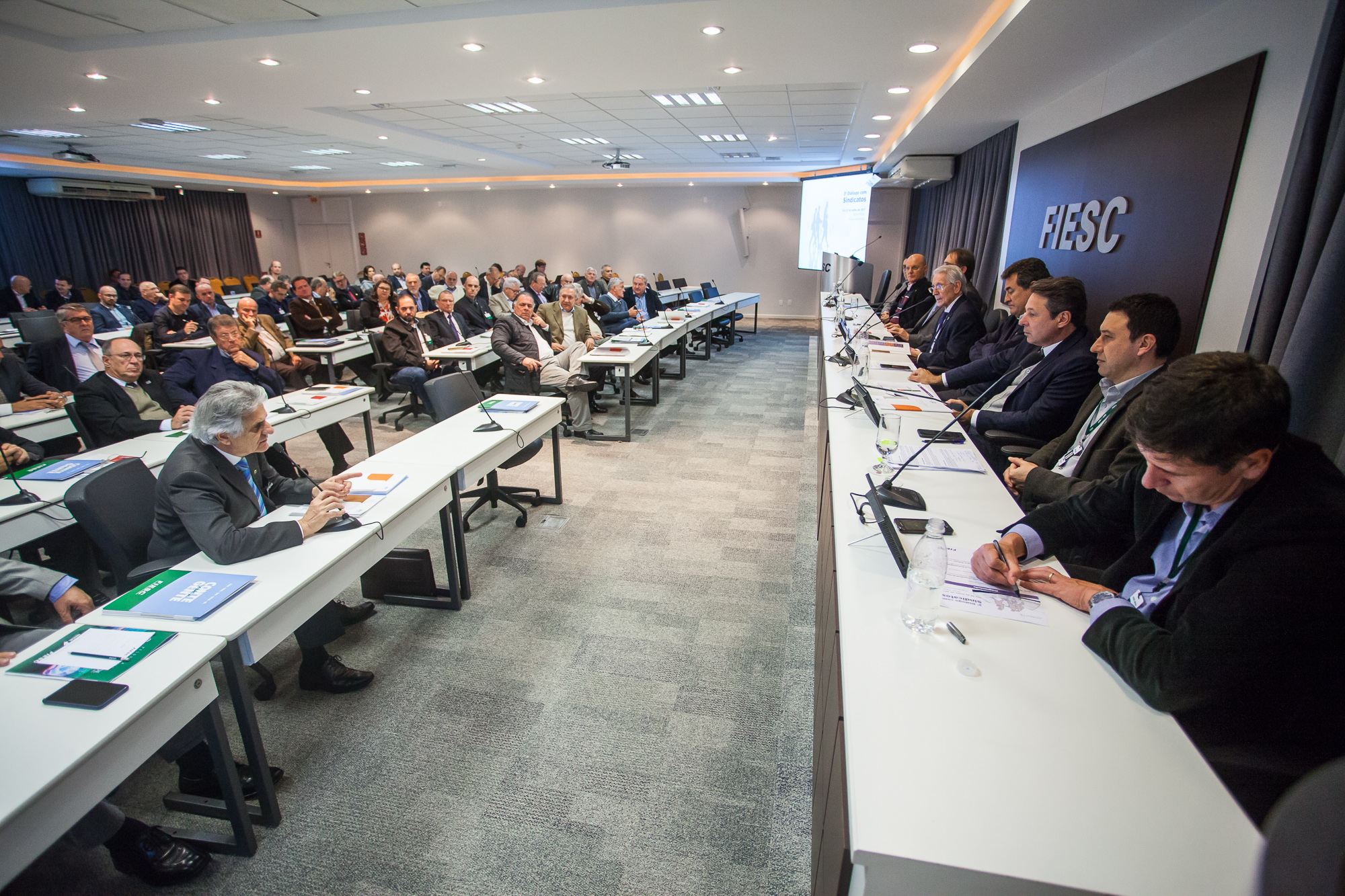 Florianópolis, 22.6.2017 – Nove em cada dez sindicatos industriais de Santa Catarina adotam a política de oferecer serviços para a elevação da competitividade das empresas associadas e o fazem principalmente com parcerias com o SESI, SENAI e IEL. O índice foi constatado na Pesquisa Sindical 2016 - panorama da situação e da atuação dos Sindicatos Empresariais da Indústria, realizada pela CNI e pela FIESC. Os resultados foram apresentados no 3º Diálogo com Sindicatos, promovido pela FIESC, nesta quinta-feira, 22. O encontro é um dos canais de comunicação para ampliar cada vez mais a proximidade entre os presidentes de sindicatos industriais e a Federação, buscando subsídio para a gestão da entidade.