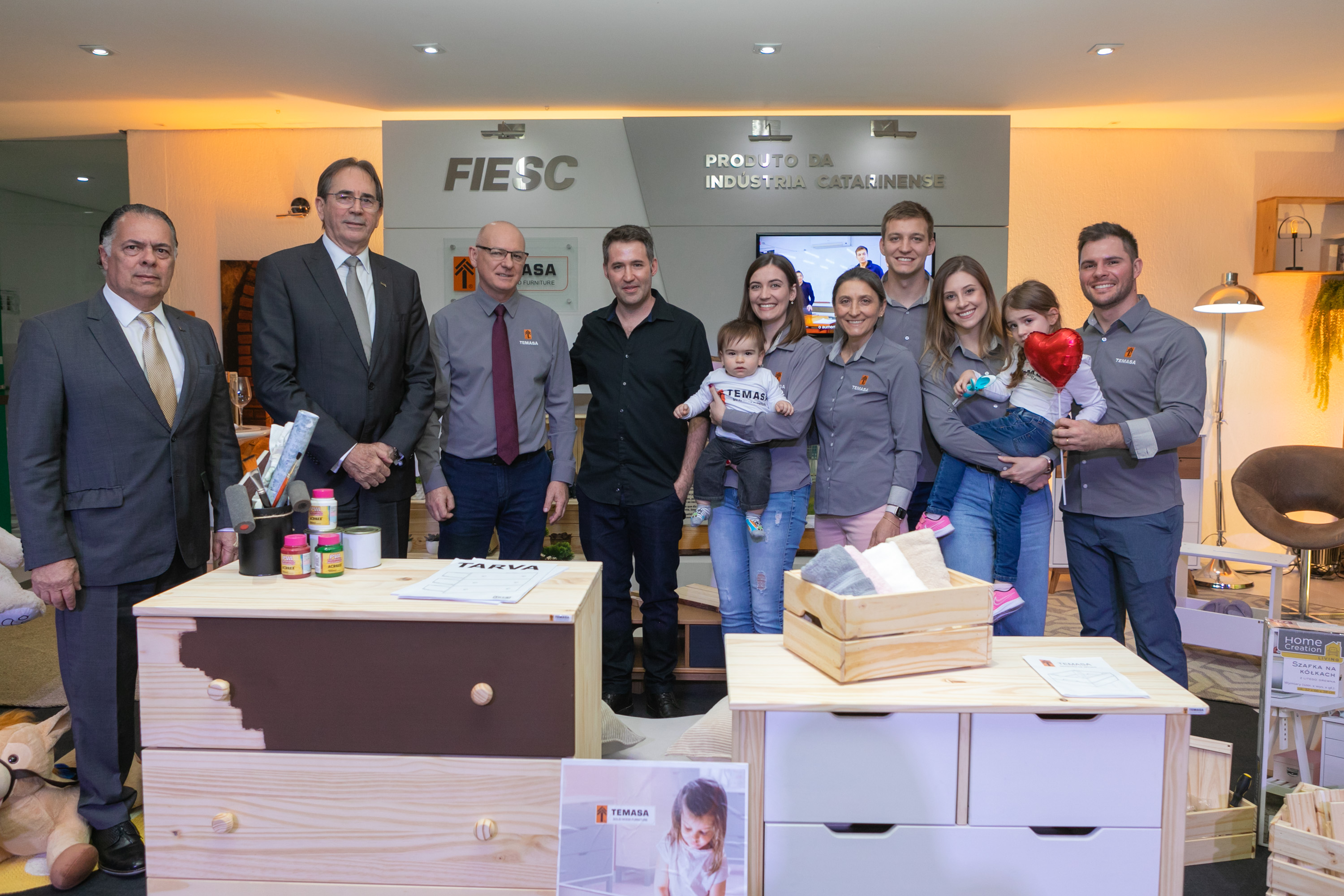 Florianópolis, 22.7.2022 – A Temasa, indústria moveleira, com sede em Caçador, expõe uma mostra dos seus produtos no Espaço Indústria, ambiente localizado na Federação das Indústrias de Santa Catarina (FIESC), em Florianópolis. O espaço, que apresenta todos os meses o trabalho de empresas catarinenses, retoma as atividades neste mês. Durante reunião de diretoria da Federação, nesta sexta-feira, dia 22, o casal Lire e Leonir Antônio Tesser fez uma apresentação em que contou um pouco da história de superação da indústria familiar, que exporta cem por cento da produção, emprega 700 colaboradores, e tem no portfólio clientes como a sueca IKEA, marca global de móveis e decoração.