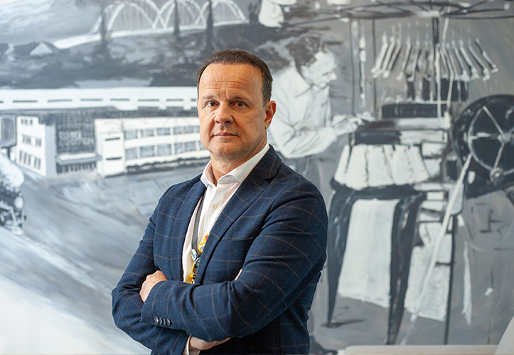 Produzida em acrílica pelo artista blumenauense Jean Tomedi, a arte que ocupa toda uma parede da sala do presidente e fundador da Tex Cotton, Sérgio Ferrari, conta algumas histórias sobre a indústria do vestuário de Santa Catarina. À direita, um trabalhador de óculos e camisa branca opera uma máquina de tear. É o avô de Sérgio, Leopoldo Ferrari, que em 1965 foi premiado como Operário Padrão de Blumenau e Santa Catarina pelo desempenho na Cia. Hering. No lado oposto, uma locomotiva a vapor passa em frente ao prédio que a Tex Cotton arrematou em um leilão em dezembro de 2018, e que pertenceu por décadas a uma das marcas que ajudou a dar fama internacional para a indústria catarinense: a Sulfabril.