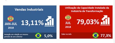 O faturamento de julho registrou crescimento de 15,5% em relação ao mesmo mês em 2017, revelam os dados livres de influência sazonal. Das 14 atividades pesquisadas, 11 registraram ampliação das vendas. As maiores variações positivas foram registradas em produtos alimentícios (41,6%), produtos de metal (35,7%) e em móveis (19,6%). As atividades que tiveram queda no período foram produtos têxteis (-2,6%), celulose e papel (-0,7%) e borracha e matéria plástico (-0,09%).