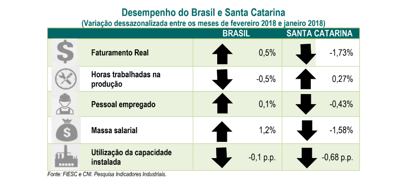 Resultado nacional: Depois de dois meses consecutivos de queda, o faturamento da indústria brasileira aumentou 0,5% em fevereiro na comparação com janeiro, na série livre de influências sazonais. Com isso, o faturamento real é 6,5% superior ao registrado em fevereiro de 2017, informa pesquisa da Confederação Nacional da Indústria (CNI). Conforme o levantamento, as horas trabalhadas na produção caíram 0,5% em fevereiro frente a janeiro, na série de dados dessazonalizados, interrompendo uma sequência de três resultados positivos. Na comparação com fevereiro do ano passado, as horas trabalhadas na produção cresceram 1%. O nível de utilização da capacidade instalada ficou em 78%, praticamente o mesmo de janeiro, e está 1,4 ponto percentual acima do registrado em fevereiro de 2017.